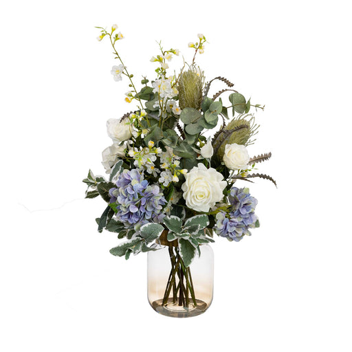 Faux Hydrangea Banksia Arrangement In Glass 80cm