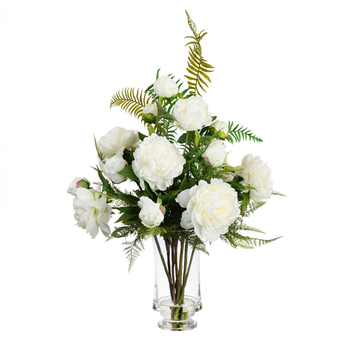 Peony & Banksia Mixed Arrangement in a Glass White - 30cm