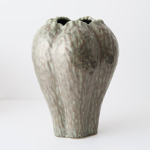 This striking ceramic vessel showcases an exquisite finish technique that unveils a sophisticated interplay of earthy tones and sculptural contours...