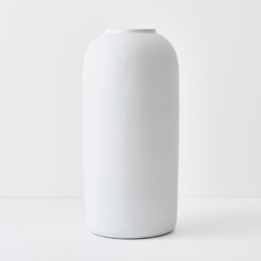 This tall, cylindrical white pot features a gently tapered opening, ideal for showcasing large statement stems or slender, upright plants. Its comm...